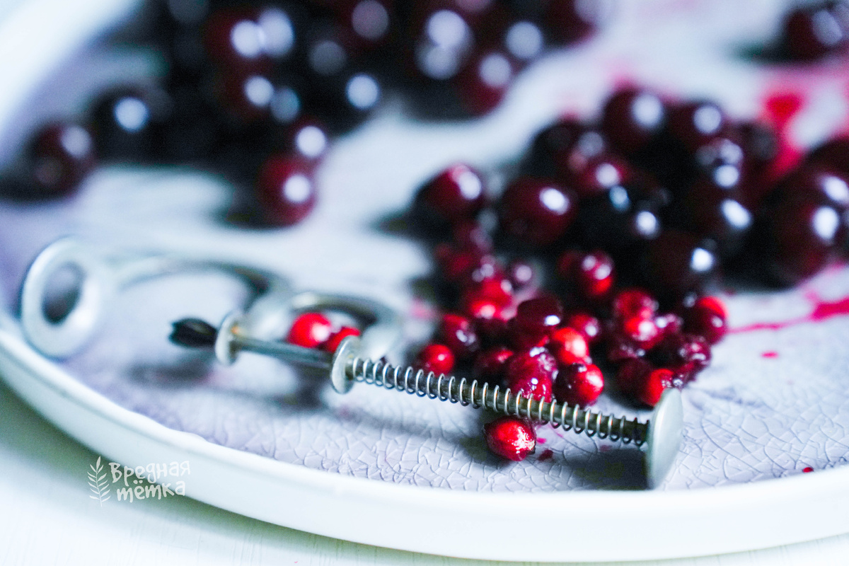 Как называется эта штучка для вишни? Есть у вас такая? Я на рынке купила. Варенье не варю давно, но вот пригодилась всё равно. Вчера на рынке вязла вишню по 250 р за литр. Кислая. Вообще все ягоды в этом году кислые в Марий Эл — сказывается холодный и дождливый июнь. Сейчас у нас жара и дожди. Настроение запекать вишню с куриной грудкой и розмарином. В открытое окно доносятся звуки играющей детворы и чьего-то ремонта. Кот орёт непонятно почему. А у меня в вазе стоит душица и если закрыть окно, то ничего слышно не будет. Только я, курица, вишня и душица. А вкусно вышло! Никакой премудрости: просто куриная грудка, вишня, лук ялтинский, чеснок и розмарин. Запекала 20 минут при 180°С под фольгой, потом кулинарным термометром проверила грудку в самом толстом месте. Если есть 73°, значит ещё сочная и уже готова. Чуть передержать и будет сухая. Буду ещё с абрикосами и куриными голенями так экспериментировать.
