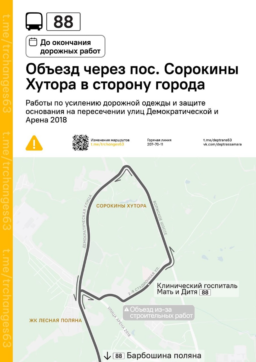 🚌🚌В Самаре временно меняется движение автобусов по маршруту №88 Это связано с тем, что на перекрестке улиц Демократической и Арены-2018 будут проводить важные дорожные работы. Специалисты планируют укрепить дорожное покрытие и защитить его основу. По новой временной схеме автобусы № 88, которые едут «в сторону города», будут следовать по измененному маршруту. Они поедут от остановки «Клинический госпиталь Мать и Дитя» по улице 2-й Стадионной, затем свернут на Волжское шоссе и только после этого выедут на улицу Демократическую. Далее автобус продолжит движение по своему обычному маршруту. Важно отметить, что направление «из города» для маршрута № 88 остается без изменений. А так же рассказали, в какую цену обозначили расчетный тариф поездки в метро, подробнее в нашей статье. 📸: Департамент транспорта Самары