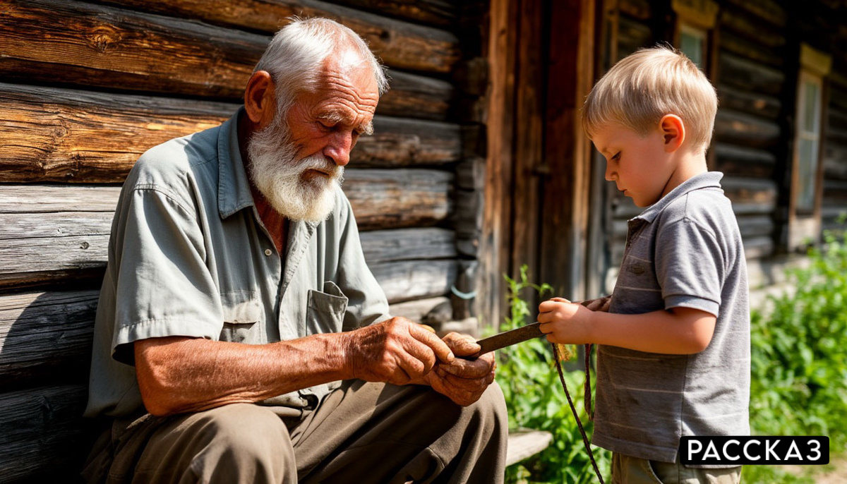 Сам дед сидел на завалинке, прислонившись к теплым, шершавым бревнам. Рядом валялась потрепанная картузная кепка. Голова его, с редкими прилипшими ко лбу волосами, была опущена. Казалось, задремал старик. В руках он держал кривой кусок стекла, обмотанный изолентой, – правил им серп перед покосом, да видно, умаялся. Серп, уже блеснувший острой полосой, лежал на коленях.