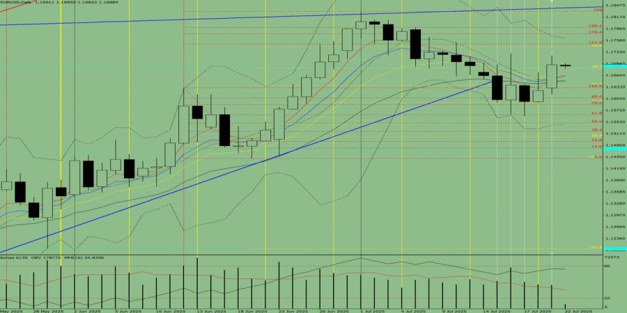 Во вторник рынок, от уровня 1.1692 (закрытие вчерашней дневной свечи), может продолжить движение вверх, с целью 1.1739 – откатный уровень 23.6% (жёлтая пунктирная линия). При тестировании этого уровня цена, возможно, откатит вниз, с целью тестирования верхнего фрактала – 1.1721 (дневная свеча от 16.07.2025 года).