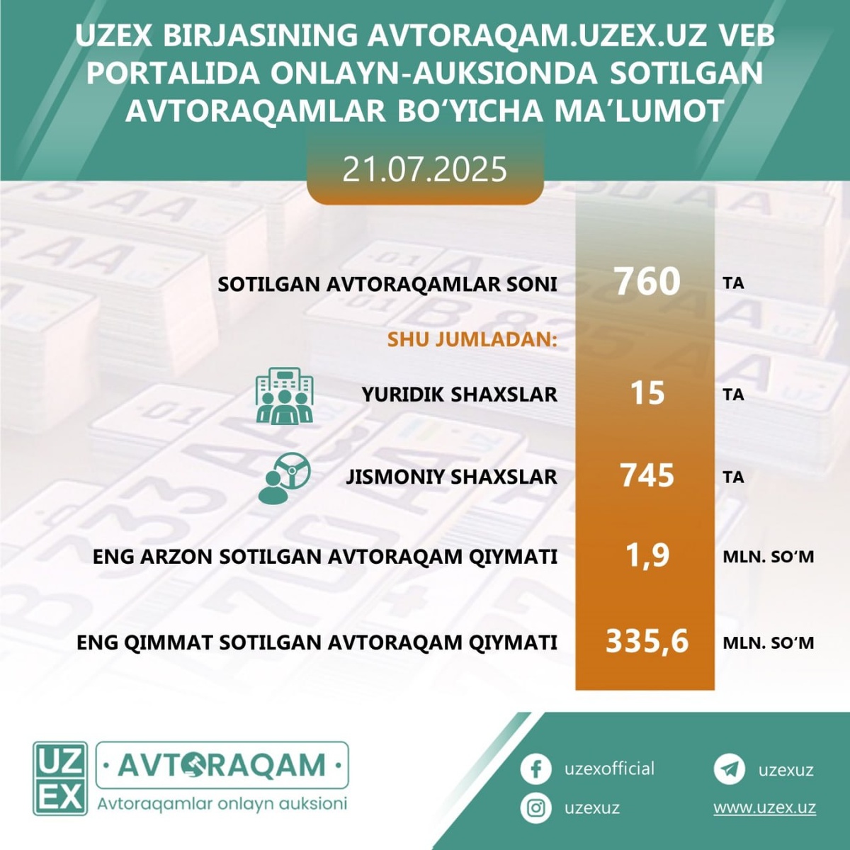 21-iyul kuni jami 760 ta avtoraqam sotilgan.