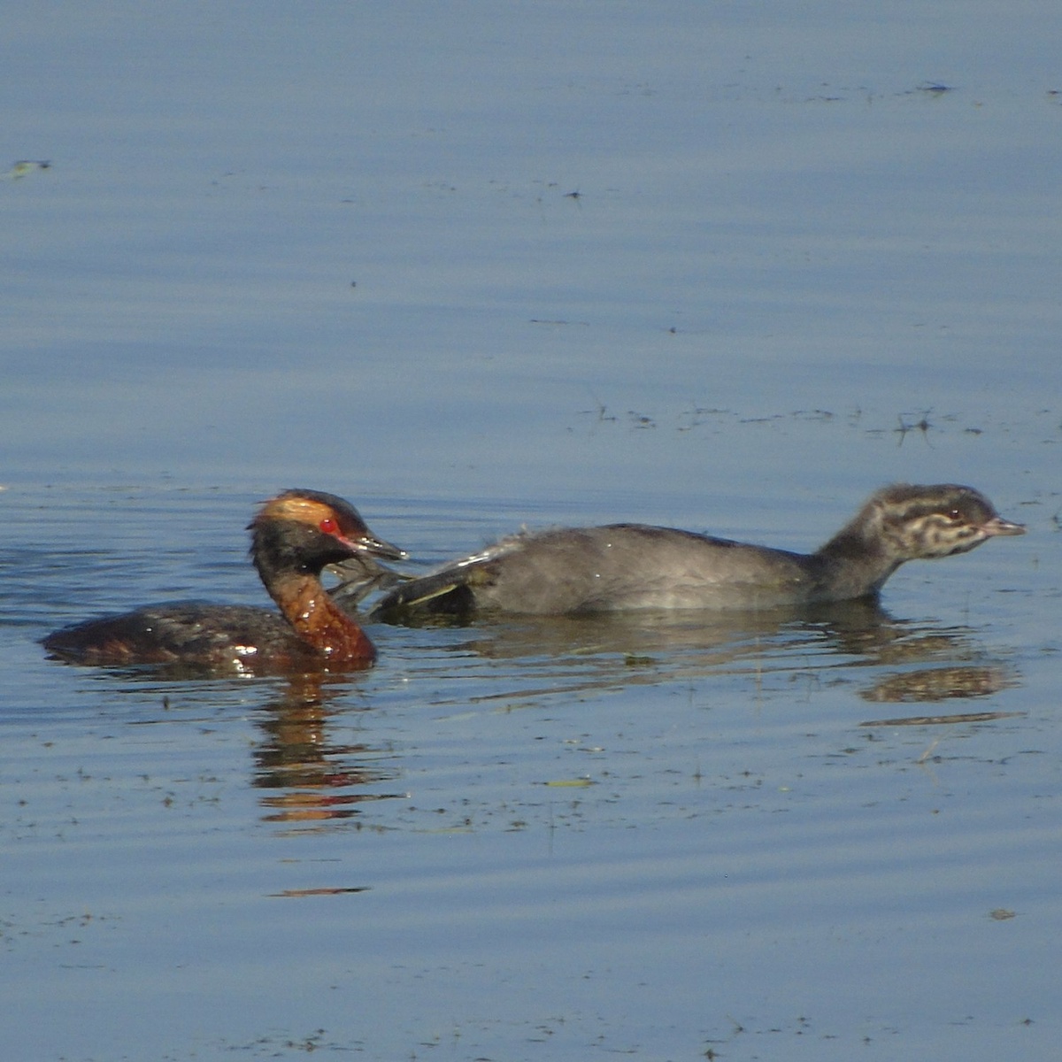 Красношейная поганка и ее дитя. Дитя показывает как оно умеет в потягушечки, отчего кажется, что оно уже больше взрослой птицы