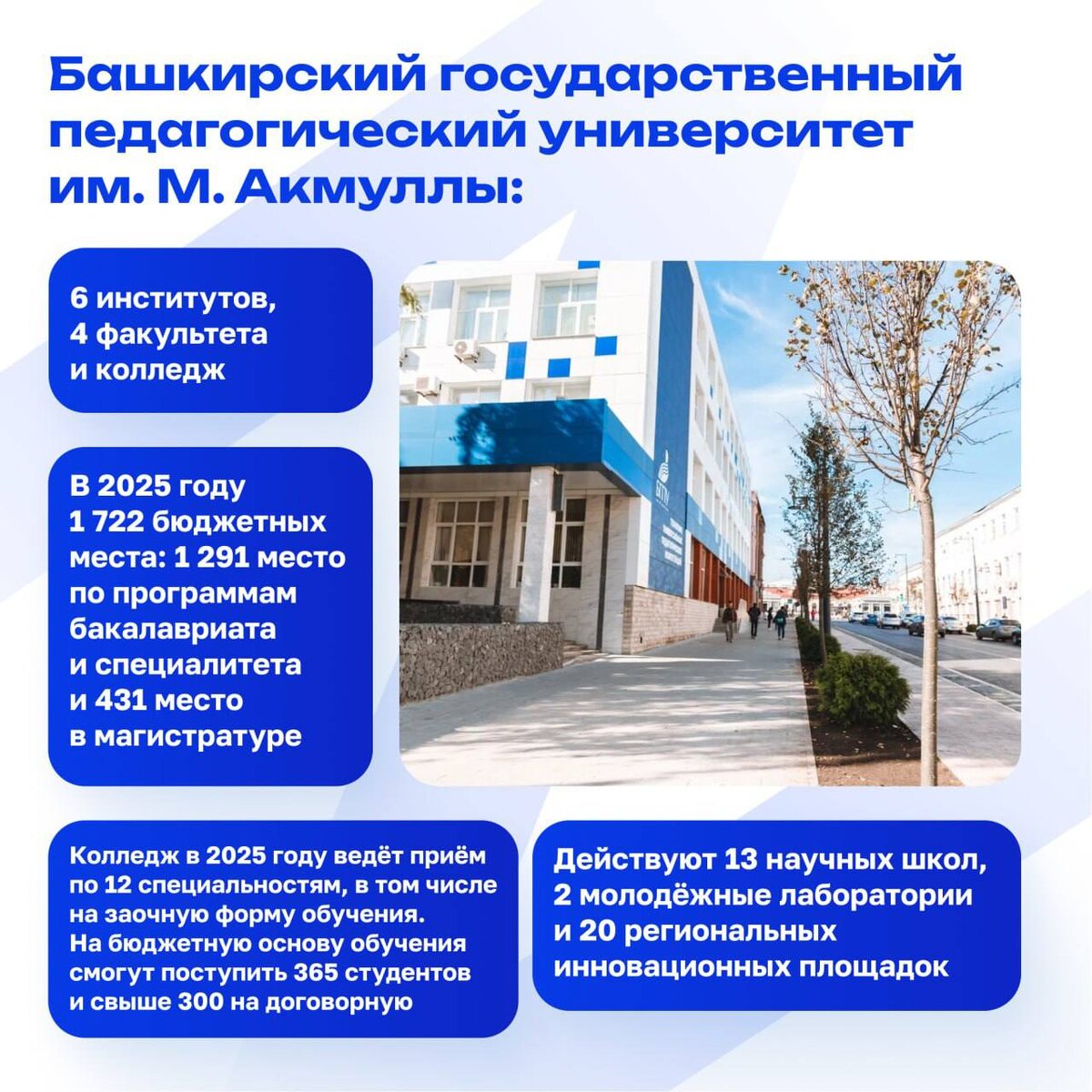 🌟В Башкирском государственном педагогическом университете им. М. Акмуллы вы можете стать квалифицированным специалистом, получить актуальные знания от опытных преподавателей. Кроме того, здесь сосредоточен широкий спектр программ и направлений, позволяющих каждому найти свой профиль: от начального образования до социальной работы и психологии. 🔸 Какие программы бакалавриата и магистратуры появились в этом году в БГПУ? 🔸 Как изменится стипендия для студентов-целевиков? 🔸 Куда вуз может направить студентов на стажировку? Читайте в карточках.