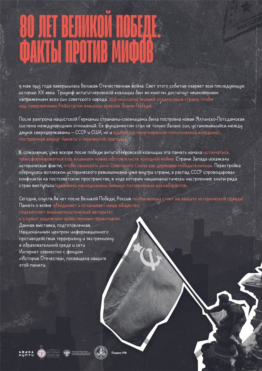 Новая выставка «80 лет Великой Победы. Факты против мифов». Скачивайте и проводите в своем учреждении В 2025 году мы отмечаем 80-летие Победы в Великой Отечественной войне — события, ставшего поворотным не только для истории нашей страны, но и всего XX века. Однако вместе с признанием заслуг советского народа мы всё чаще сталкиваемся с попытками искажения исторической правды. В новой выставке «80 лет Великой Победы. Факты против мифов», подготовленной проектом «Подвиг.РФ», НЦПТИ и фондом «История Отечества», рассматриваются главные заблуждения, касающиеся истории Великой Отечественной войны. Скачать выставку можно по ссылке: https://disk.yandex.ru/d/d1KXbj1z59Kp_w Выставка подойдет для: • уроков истории и «Разговоров о важном»; • патриотических акций в школах, колледжах, вузах; • просветительских мероприятий в библиотеках и ДК. ❗При организации выставки просим указывать источник и использовать хэштег #подвигрф_выставка 💛 Подвиг.РФ | Поддержать канал голосом #подвигрф #нцпти #По