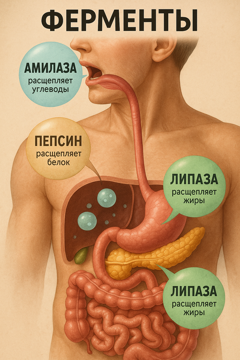 Пищеварительные ферменты — это микроскопические ножницы. Но каждое «лезвие» работает в своей точки маршрута еды. Разберём три главных и научимся помогать им простыми приёмами кухни.