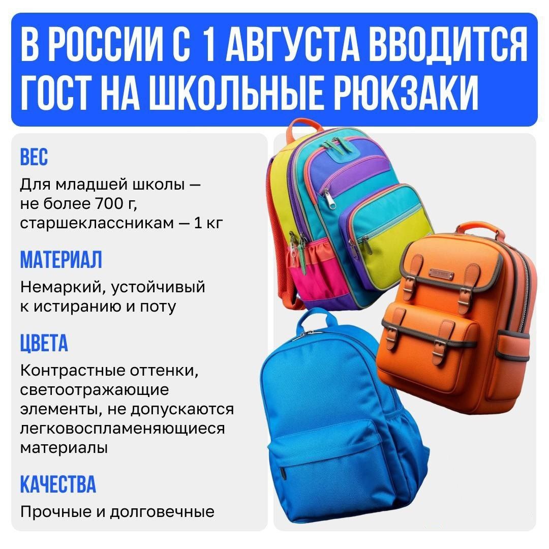 ‼️ С 1 августа вступает в силу ГОСТ по школьным рюкзакам ⚡️ Новый стандарт с рекомендациями по школьным рюкзакам разработан для повышения безопасности и удобства учеников, а также внешнего вида. 🔴 Для младших школьников — вес рюкзака не должен превышать 700 граммов без учета этикеток и дополнительных элементов. 🔵 Для старшеклассников — 1 килограмм. Также, в стандарте уделено внимание износостойкости рюкзака: ткани рюкзака должны быть устойчивы к трению и выгоранию, а краски к воздействию пота. *** ❓ Ходить в школу удобнее...? ❤️ — С рюкзаком 🔥 — С пакетом 🙏 — Со специальной сумкой 👍 — Всегда по-разному Больше информации в нашей группе, переходите