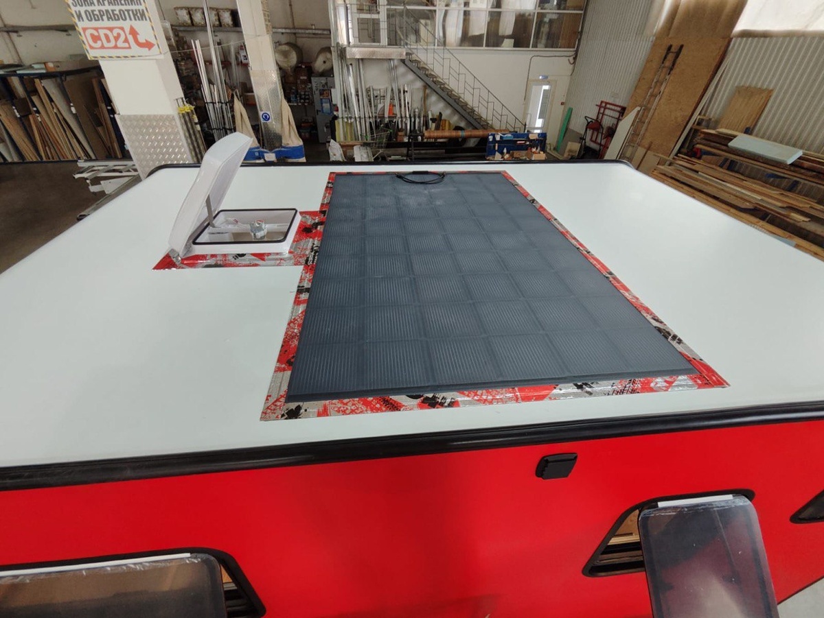 • риск ухудшения аэродинамики и дизайна крыши. Один из российских производителей автодомов поделился примером, как можно решить эту проблему. Вместо классической панели использован гибкий фотоэлектрический модуль SteelSun Si-HJT мощностью 320 Вт. Его характеристики: