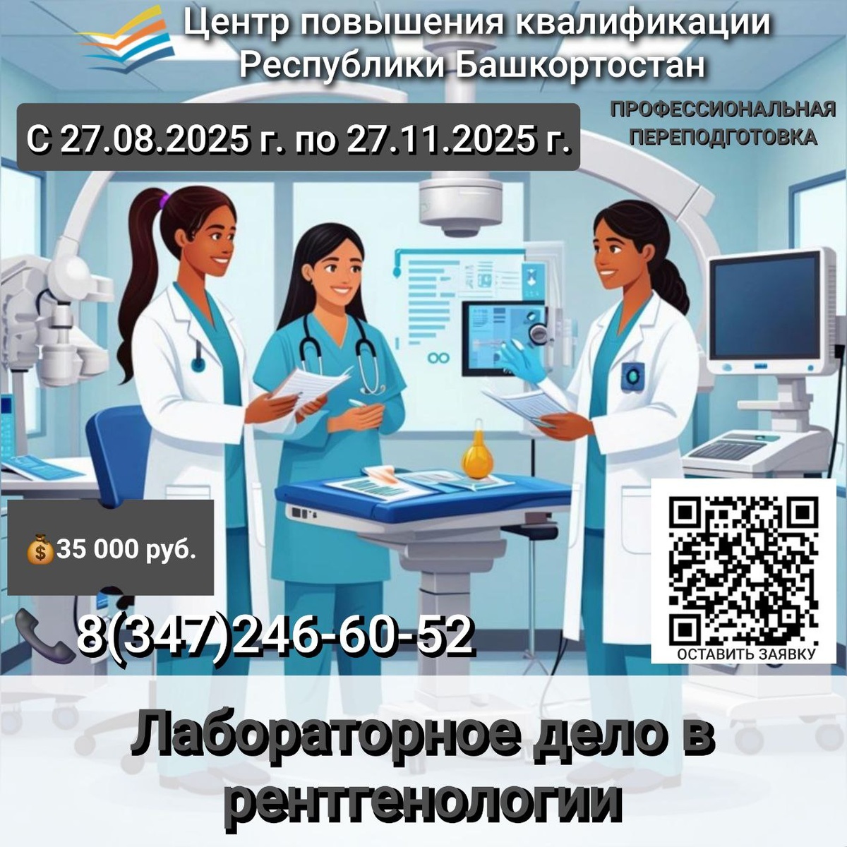 💥ВНИМАНИЮ СЛУШАТЕЛЕЙ! 🗓Центр повышения квалификации приглашает пройти обучение по программе профессиональной переподготовки «Лабораторное дело в рентгенологии». 🩻 🗓Сроки обучения: 27.08.2025 г. – 27.11.2025 г. ⏳Продолжительность обучения: 432 академических часа. 🎓Целевая аудитория: средние медицинские работники, имеющие базовое образование по специальностям: «Лечебное дело», «Акушерское дело», «Сестринское дело», «Стоматология», «Стоматология ортопедическая», «Стоматология профилактическая», «Медико-профилактическое дело», «Лабораторная диагностика». 💰Стоимость обучения: 35 000 руб. 📃По окончании выдается документ установленного образца с внесением данных в Федеральный реестр документов об образовании (ФИС ФРДО). 📎Прохождение первичной специализированной аккредитации (ПСА) возможно на базе Центра сразу после завершения обучения. 📞Телефон для справок: 8(347)246-60-52 💻Заявку можете оставить на нашем сайте: https://www.medupk.ru/npages/zayavki/frm.asp?id=379