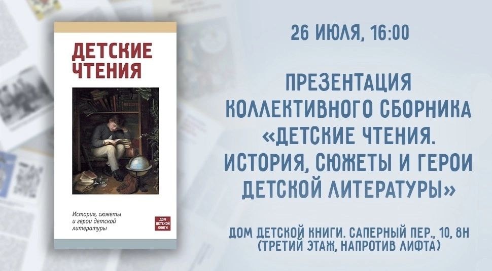 Друзья, мы снова приглашаем вас в гости к нашему хорошему другу, в Дом детской книги в Санкт-Петербурге — на разговор о детской литературе и чтении с современными учеными и исследователями. В субботу, 26 июля, в Доме Детской книги пройдёт презентация книги «Детские чтения. История, сюжеты и герои детской литературы». Обсудим актуальные проблемы и неожиданные открытия мира детской литературы вместе с опытными учеными и исследователями, чьи статьи вошли в книгу. Спикеры: Валентин Головин, Николай Гуськов, Ольга Лучкина, Светлана Маслинская, Кирилл Маслинский, Анна Сенькина, Инна Сергиенко. В сборник вошли статьи об истории русской детской литературы, анализ некоторых жанров детской книги, текстологические разыскания и советы по «налаживанию мостов» между разными поколениями читателей. Авторы обратились к изучению классических произведений А. Гайдара, В. Драгунского, В. Крапивина, С. Маршака, М. Яснова и других. Есть здесь и статьи о забытых произведениях детской литературы, которыми зачи