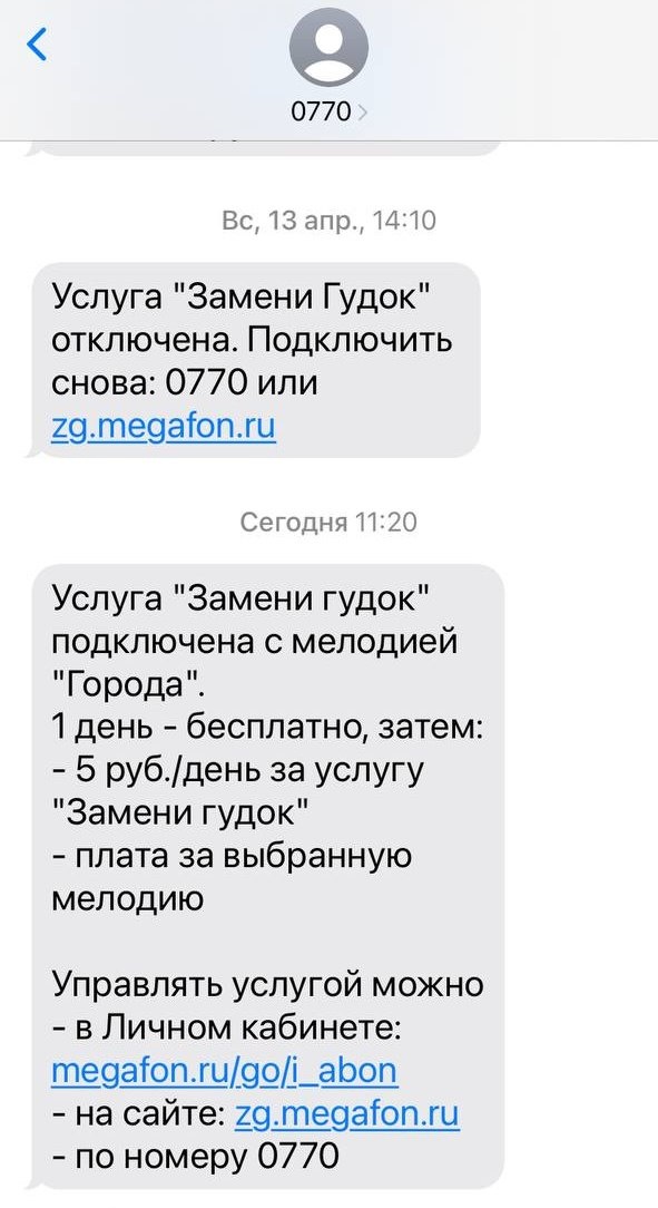 📞 Оператор сотовой связи «Мегафон» в очередной раз втихаря «подкинул» платную услугу «Замени гудок». Радостное сообщение о новой услуги в очередной раз прилетело на один из моих номеров телефонов. Причём, смс пришло не от Мегафона, а с короткого номера 0770, которым этот оператор пользуется для предоставления доступа к развлекательным услугам, в частности, «замени гудок» (ранее этим номером пользовался МТС). Сообщение гласило, что плата будет взиматься начиная со следующего дня, а для отключения нужно сделать финт ушами набрать определенный код (который не так-то просто отыскать) или отключить через приложение. Поскольку это уже не первый случай вероломного навязывания услуг «Мегафоном» и зная, что код USSD-запрос не всегда срабатывает оперативно (так, собственно, и случилось), отключил через приложение. Оператор скорее всего будет утверждать, что «только пользователь может подключить/отключить услуги». Но в данном случае нужно быть круглым идиотом, чтобы поверить в эти слова – на