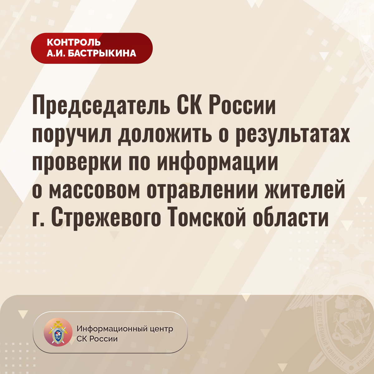 Председатель СК России поручил доложить о результатах проверки по информации о массовом отравлении жителей г. Стрежевого Томской области В СМИ сообщается, что 20 июля текущего года в городе Стрежевом Томской области после потребления в пищу продукции местного заведения общественного питания в медицинские учреждения обратились более десяти человек, пятеро из которых дети. Нескольким пострадавшим потребовалась госпитализация. В СУ СК России по Томской области организована процессуальная проверка. Председатель Следственного комитета Российской Федерации Александр Иванович Бастрыкин поручил руководителю СУ СК России по Томской области Андрею Викторовичу Щукину представить доклад о промежуточных результатах процессуальной проверки и принятом по итогам решении. Исполнение поручения, а также ход процессуальной проверки поставлены на контроль в центральном аппарате ведомства. #СледственныйКомитет #СКРоссии #СКР #ИЦСКР #ИнформационныйЦентр #АлександрБастрыкин #ПредседательСКР #КонтрольПредседа
