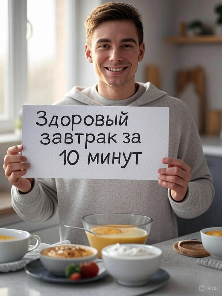 Утро — время, когда каждая минута на счету. Но это не повод пропускать завтрак или есть что попало! Сегодня я поделюсь тремя рецептами полезных завтраков, которые готовятся за 10 минут, заряжают энергией и не вредят фигуре. Погнали! Почему завтрак важен? Полезный завтрак запускает метаболизм, улучшает концентрацию и даёт силы на весь день. Главное — сочетать белки, углеводы и полезные жиры. И не переживайте: все рецепты ниже простые, из доступных продуктов, а времени уйдёт меньше, чем на сборы перед работой! Рецепт 1: Овсянка с фруктами и орехами (7 минут) Ингредиенты (на 1 порцию): Овсяные хлопья (быстрого приготовления) — 4 ст. л. Молоко (или вода) — 200 мл. Банан — 1 шт. Горсть орехов (грецкие, миндаль) — 10 г. Мёд или ягоды — по вкусу. Как готовить: Залейте овсянку горячим молоком (или водой) в миске. Накройте и дайте постоять 3 минуты. Нарежьте банан кружочками, измельчите орехи. Добавьте фрукты и орехи к овсянке, полейте мёдом или посыпьте ягодами. Перемешайте и наслаждайтесь!