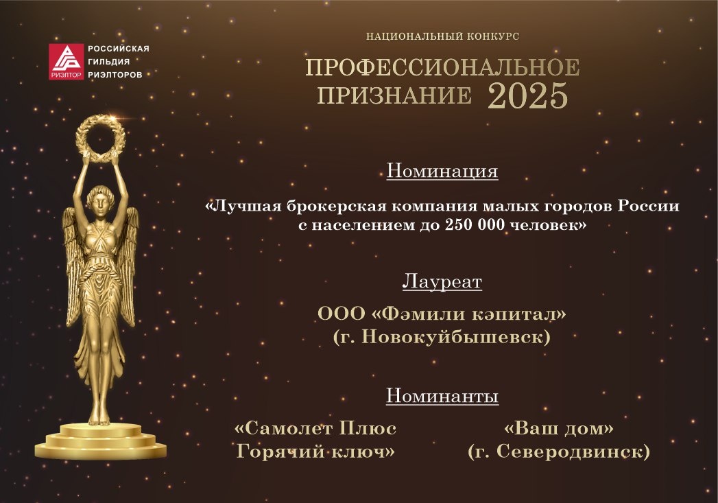 Кто в малых городах в этом году стали лидерами рынка недвижимости? Продолжаем знакомство с победителями Национального конкурса РГР «Профессиональное признание – 2025»! В номинации «Лучшая брокерская компания малых городов России с населением до 250 000 человек» победу одержали: 🔷 ООО «Фэмили кэпитал» (г. Новокуйбышевск) — лауреат 🔷 «Самолет Плюс Горячий ключ» — номинант 🔷 «Ваш дом» (г. Северодвинск) — номинант Поздравляем победителей! Желаем новых профессиональных вершин, устойчивого роста и ярких достижений! «Профессиональное признание» – это ежегодное событие, которое объединяет лучших представителей рынка недвижимости со всей страны. Конкурс помогает делиться лучшими практиками, поддерживает национальные стандарты в профессии и, конечно, вдохновляет на развитие! #конкурсРГР #профессиональноепризнание2025