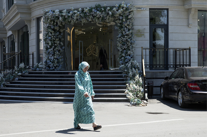 Но при всей креативности чеченских дизайнеров в Грозном нет ни одного магазина одежды, который был бы похож на модный дом Firdaws. Главный шоурум находится на улице Кабардинской. Его легко узнать по витиеватой лестнице, огромным витринам и роскошным нарядам безликих манекенов. Дверь в него — словно вход в замок.