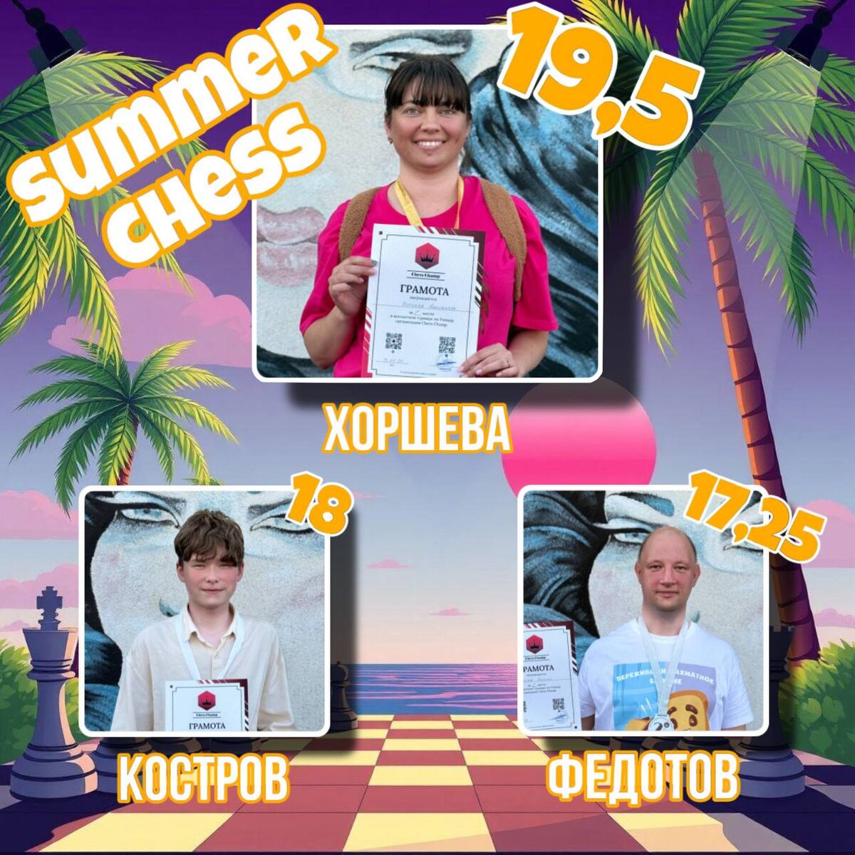 Главные претенденты на победу в регулярном чемпионате «Summer Chess» на данный момент🔥 1 - Хоршева (19,5) 2 - Костров (18) 3 - Федотов (17,25) 4 - Каменев (15,75) 5 - Максимович (15,75)
