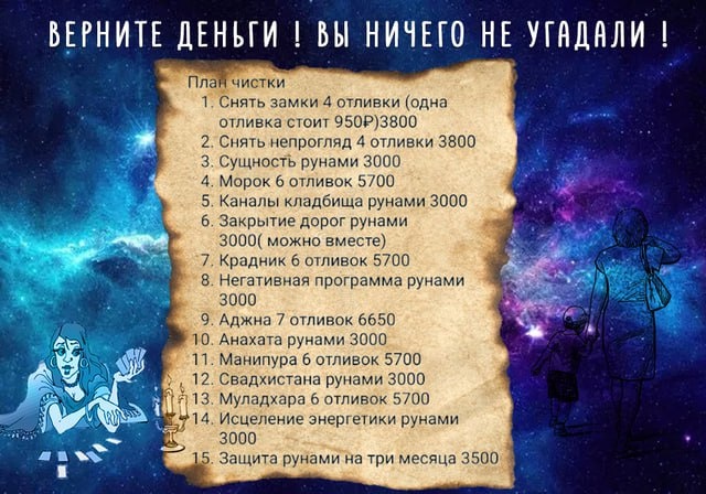 Верните деньги! Вы везде неугадали! Так я назвал эту поучительную историю, случилась которая полгода назад. Обратился ко мне мужчина 55+ лет, с запросом на консультацию. Изначально озвученная проблема была связана с дележкой участка на даче. В итоге пришли к тому, что, опять же с его слов – мама испортила ему всю жизнь и сосала его, кстати он до сих пор живет с ней. Но есть еще и девушка, которая ему сделал приворот(егильет), из-за того что ему привели её знакомиться в 18 лет – а он ей отказал. Духи сразу подсказали, что человек прибывает в заблуждениях, но все же диагностика была проведена. В работу я человека не взял, по совету Духов, но подсказал как попробовать самостоятельно побороться. Решением было обращение к Богам и небольшая магическая коррекция, чтоб увеличить шансы на дележку участка. Никаких егильетов, крадников, и мамы дракулы….Конечно, клиент, задал вопрос – «а у меня получится». Вопрос, кстати, распространенный.)) Но откуда мне знать? Слишком много переменных, и челове