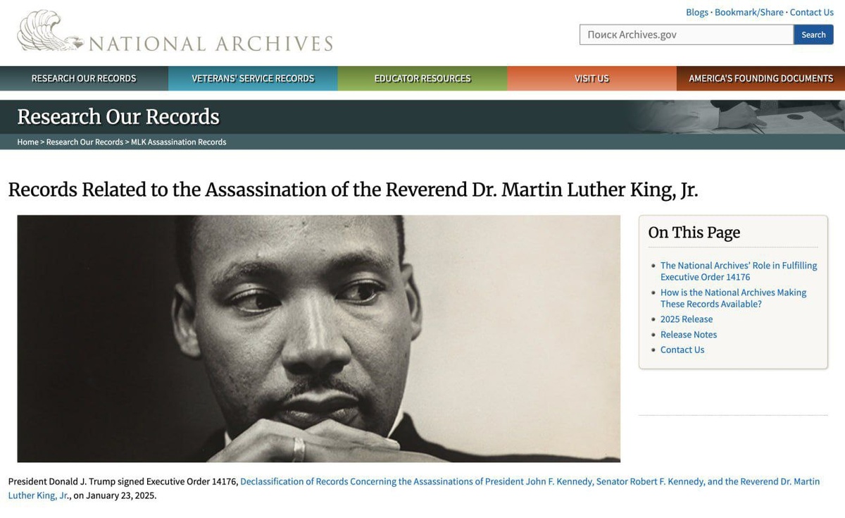 В США рассекретили более 230 тыс. документов об убийстве Мартина Лютера Кинга. Материалы доступны на сайте Национального архива США, сообщила глава американской нацразведки Тулси Габбард. Опубликованные документы — служебные записки Федерального бюро расследований, сводки Центрального разведывательного управления. Некоторые из документов были оцифрованы впервые. Мартин Лютер Кинг — лидер движения за гражданские права чернокожих в США. Он был застрелен 4 апреля 1968 года Джеймсом Эрлом Реем в Мемфисе. В марте Национальный архив США, в соответствии с указом президента Дональда Трампа, обнародовал свидетельства о гибели 35-го американского президента Джона Кеннеди. Этим же указом господин Трамп распорядился рассекретить документы об убийстве брата господина Кеннеди Роберта. https://t.me/geochronic | https://geochronic.ru