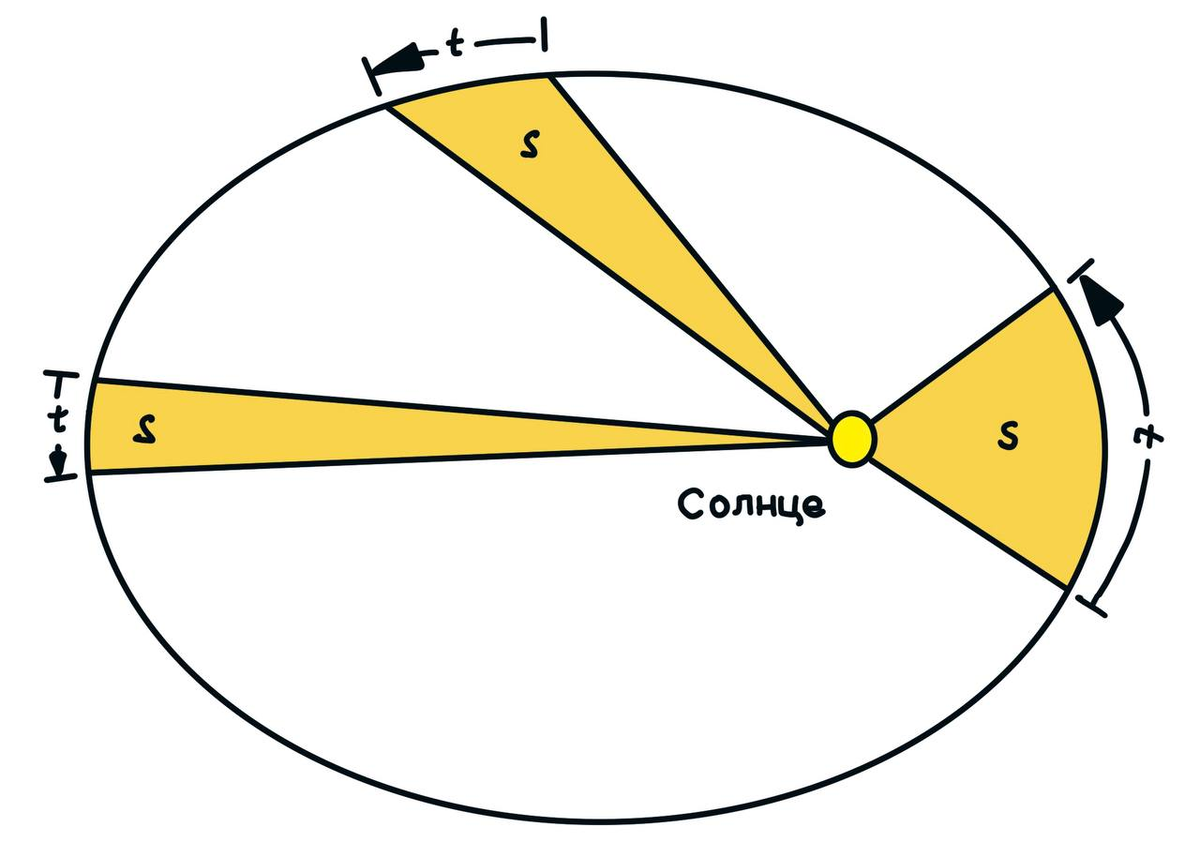 "Орбита каждой планеты представляет собой эллипс, в одном из фокусов которого находится Солнце." Этот закон отверг древнее представление о круговых орбитах. Кеплер показал, что планеты движутся по вытянутым траекториям (эллипсам), причем Солнце расположено не в центре, а в одном из фокусов. Чем больше вытянута орбита, тем больше её эксцентриситет. Например, у Меркурия орбита наиболее эллиптическая среди планет Солнечной системы, а у Венеры — почти круговая "Радиус-вектор, соединяющий планету и Солнце, за равные промежутки времени заметает равные площади." Это означает, что планета движется быстрее, когда находится ближе к Солнцу (в перигелии), и медленнее — в дальней точке (афелии). Например, Земля в январе (в перигелии) движется быстрее, чем в июле. Этот закон фактически является следствием сохранения момента импульса "Квадраты периодов обращения планет вокруг Солнца относятся как кубы больших полуосей их орбит." Этот закон позволяет связать орбитальные характеристики разных планет. Н