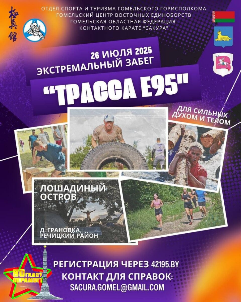 «Трасса-95» – открытые состязания, представляющие собой забег по пересеченной местности с препятствиями под контролем организаторов. Состязания пройдут 26 июля в Речицком районе около д. Грановка на территории агроусадьбы «Лошадиный остров». Участников ждут плавание, перенос мешка с песком, проход дождевой трубы, перенос бревна в болоте, лестница на жгутах, лазание по канату, туристическая веревка, перекатывание покрышки и многое другое. К соревнованиям допускаются лица не моложе 12 лет, не имеющие медицинских противопоказаний и при наличии расписки от родителей. Всю ответственность за свою безопасность на дистанции совершеннолетние участники берут на себя. Категории участников для дистанции: Зарегистрироваться можно по ссылке.