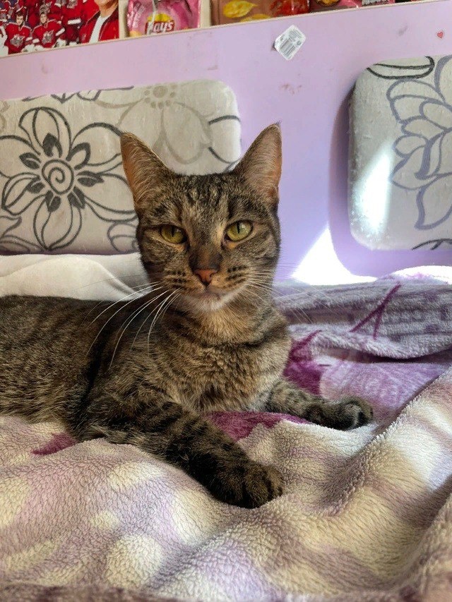 Нашли её в трансформаторной будке с иголкой поперек горла. Возраст около двух лет, стерильна, лоточек на пять с плюсом.