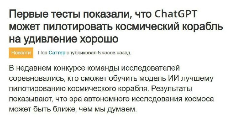 ChatGPT научился управлять космическим кораблем! И даже справился с этой задачей лучше всех конкурентов, но с оговоркой: полёты проходили в