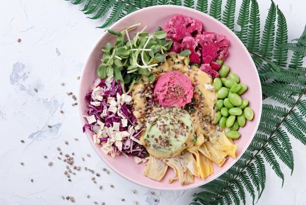 1.Ферментированная капуста: цветную капусту разобрать на соцветия, плотно поместить в стеклянную емкость, залить соком красной капусты, добавить чеснок, тростниковый сахар, соль (1 г). Сок должен полностью покрывать капусту, она не должна соприкасаться с воздухом. Оставить при комнатной температуре на 20 часов. 2.Хумус свекольный: нут замочить в воде на 12 часов. 3.Свеклу целиком, не очищая и завернув в фольгу, запекать в духовке при температуре 180 градусов 40 минут, до мягкости. 4.Нут отварить с добавлением соды до мягкости около часа. 5.Охлажденную и почищенную свеклу нарезать кубиком. 6.Поместить в чашу блендера отварной нут, кунжутную пасту (8 мл), свеклу, чесночный порошок (1 г), масло растительное (5 мл), соль (1 г), лимонный сок и измельчить до однородного состояния, добавляя воду, в которой варился нут. 7.Хумус из зеленого горошка: горошек промыть в проточной воде, отварить в течение 5 минут. 8.Поместить в чашу блендера отваренный зеленый горошек, кунжутную пасту (10 мл), чес