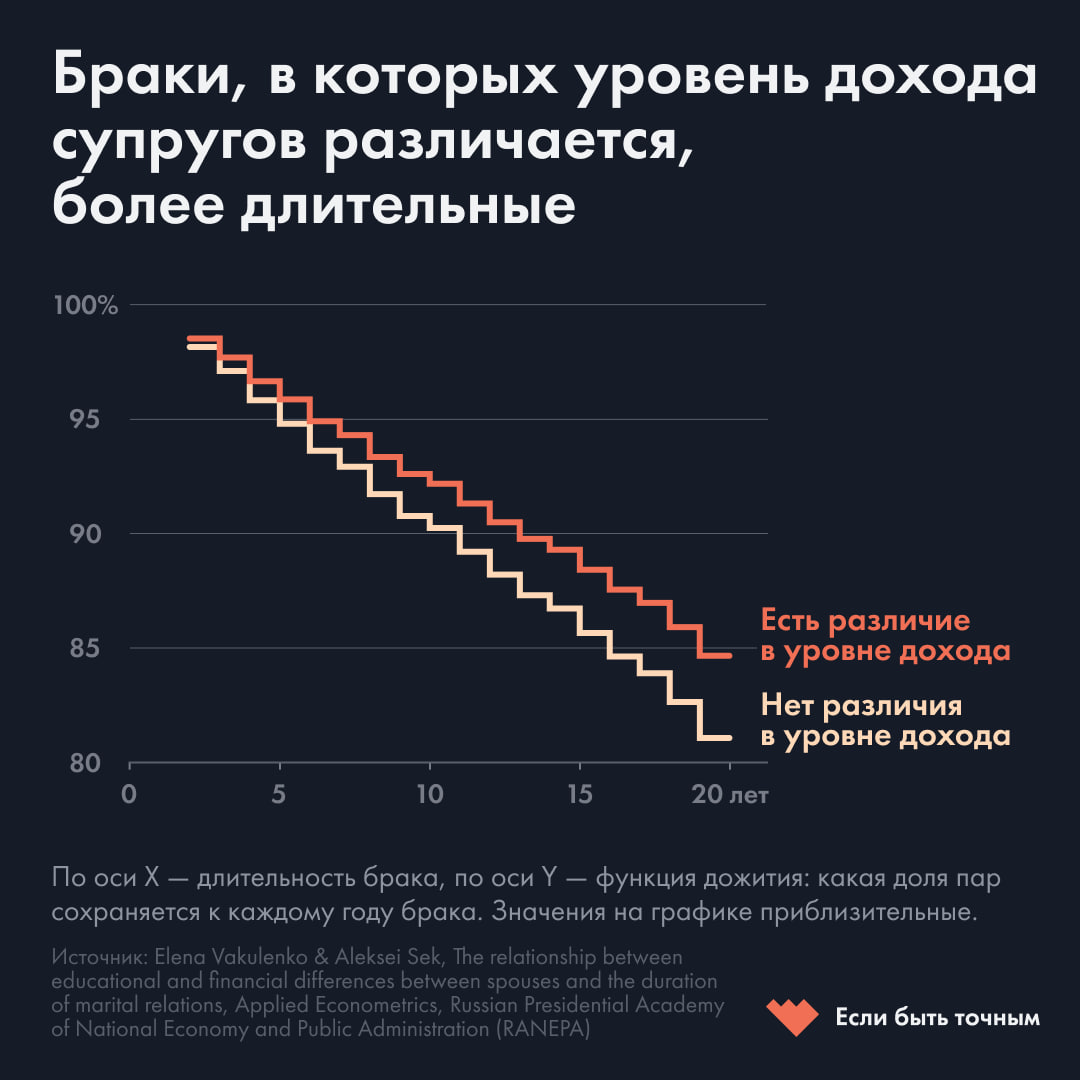 За последние 60 лет частота разводов в России более чем удвоилась. При этом влияние различий в доходах и образовании супругов на прочность брака почти не изучалось. Экономисты Елена Вакуленко и Алексей Сек выяснили, какие факторы связаны с продолжительностью брака. Например, если между супругами есть разница в доходах — брак прочнее, а вот различия в уровне образовании на его продолжительность не влияют. 🔺Если один из супругов зарабатывает заметно больше другого, риск развода снижается на 20%. Эффект сохраняется только для пар без детей — вероятно, разделение труда делает союз выгодным для обоих. 🔺Разница в уровне образования статистически не связана с продолжительностью брака. Это совпадает с рядом российских исследований, но противоречит некоторым зарубежным. 🔺Наличие детей снижает риск развода на 39%. Возможно, дети вступают как эмоциональный и «инвестиционный» семейный капитал. А может — все наоборот: менее устойчивые пары просто не заводят детей. 🔺Если муж имеет хронические з