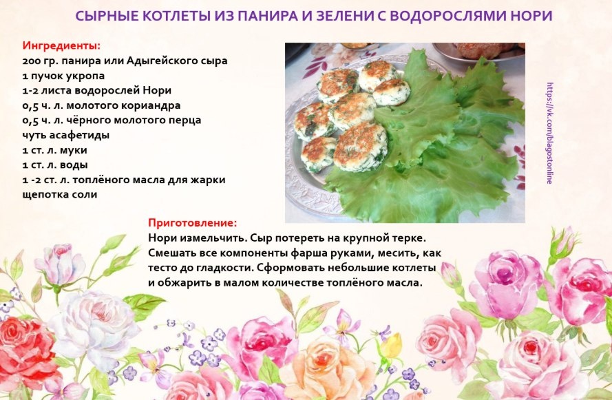 🧀 СЫРНЫЕ КОТЛЕТЫ ИЗ ПАНИРА И ЗЕЛЕНИ С ВОДОРОСЛЯМИ НОРИ 🌀 Ингредиенты: 200 гр. панира или Адыгейского сыра 1 пучок укропа 1-2 листа водорослей Нори 0,5 ч. л. молотого кориандра 0,5 ч. л. чёрного молотого перца чуть асафетиды 1 ст. л. муки 1 ст. л. воды 1 -2 ст. л. топлёного масла для жарки щепотка соли 🌀 Приготовление: Нори измельчить. Сыр потереть на крупной терке. Смешать все компоненты фарша руками, месить, как тесто до гладкости. Сформовать небольшие котлеты и обжарить в малом количестве топлёного масла.