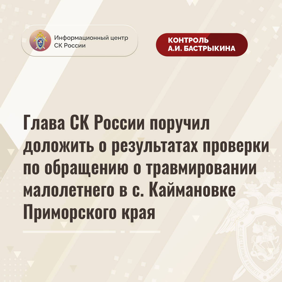 Глава СК России поручил доложить о результатах проверки по обращению о травмировании малолетнего в с. Каймановке Приморского края В комментариях в телеграм-канале Информационного центра СК России обратилась жительница Приморского края по вопросу травмирования ее десятилетнего сына в детском лагере в селе Каймановке. В июле текущего года мальчик упал с двухъярусной кровати из-за неисправности лестницы. Пострадавший госпитализирован с переломом, ему потребовалось оперативное вмешательство. В СУ СК России по Приморскому краю начата процессуальная проверка. Председатель Следственного комитета Российской Федерации Александр Иванович Бастрыкин поручил руководителю СУ СК России по Приморскому краю Эдуарду Анатольевичу Трубчику представить доклад о ходе и результатах процессуальной проверки, поставив ее на контроль в центральном аппарате ведомства. #СледственныйКомитет #СКРоссии #СКР #ИЦСКР #ИнформационныйЦентр #АлександрБастрыкин #ПредседательСКР #КонтрольПредседателяСКР #КомментарийКонтроль