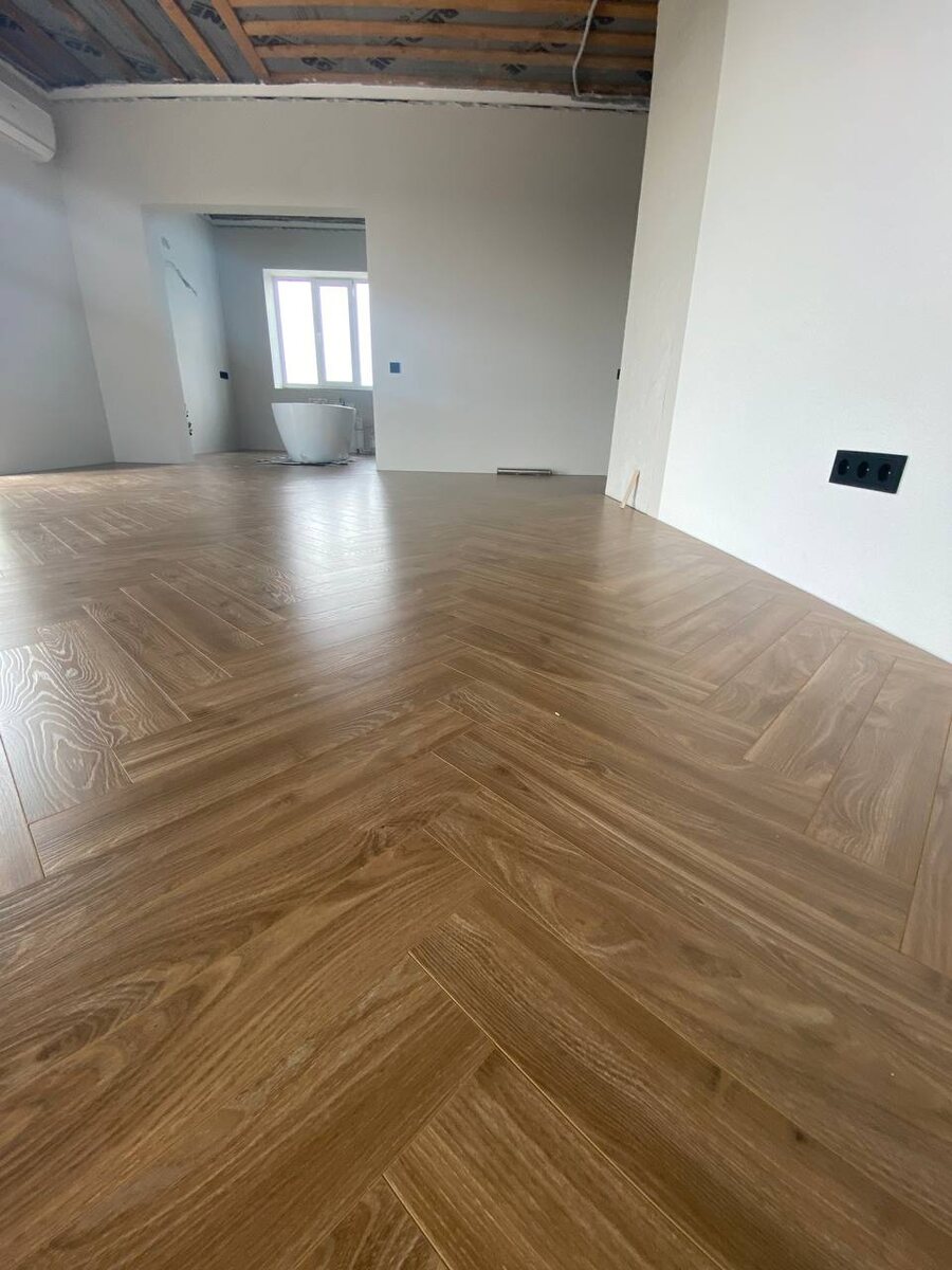 Мастера компании ПолЦены завершили монтаж стильного и практичного напольного покрытия — ламината Wood Style Arrow 106 Дуб Компаунд 🪵. Этот материал идеально подходит для современных интерьеров благодаря уникальному рисунку ёлочка, который всегда выглядит актуально и дорого ✨. Преимущества выбранного материала: