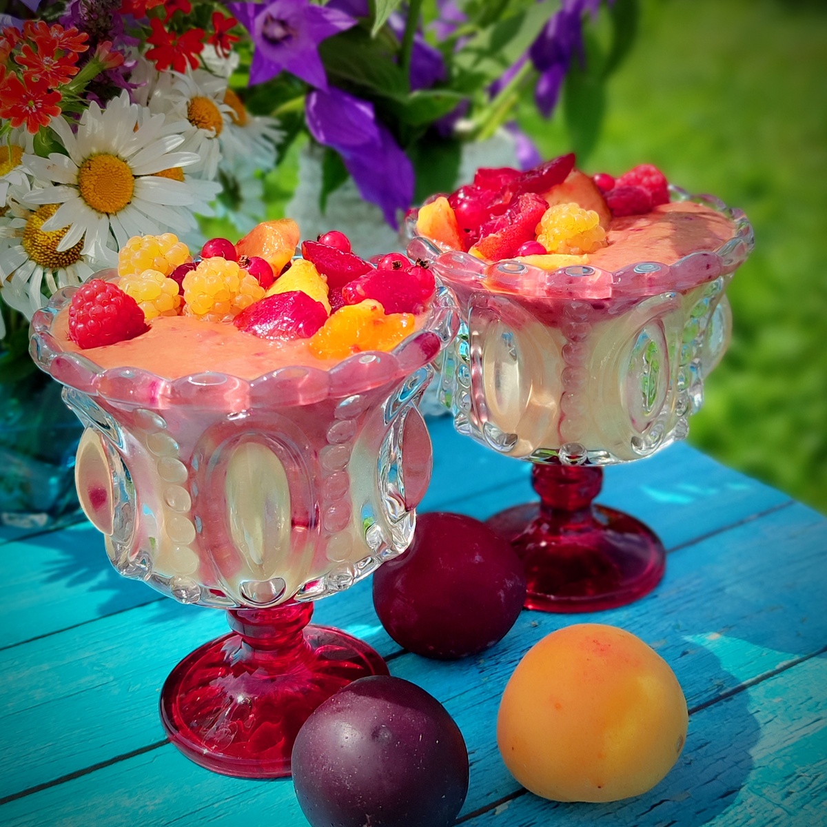 Перемалываю в блендере все ингредиенты, кроме слив, до однородной консистенции, начиная со льна. Важно хорошо перемолоть лен. ⠀ Часть отливаю в бокалы. Добавляю в блендер сливы и ещё раз слегка перемалываю. ⠀Доливаю в бокалы сверху украшаю кусочками сливы, абрикоса и ягодами с огорода.