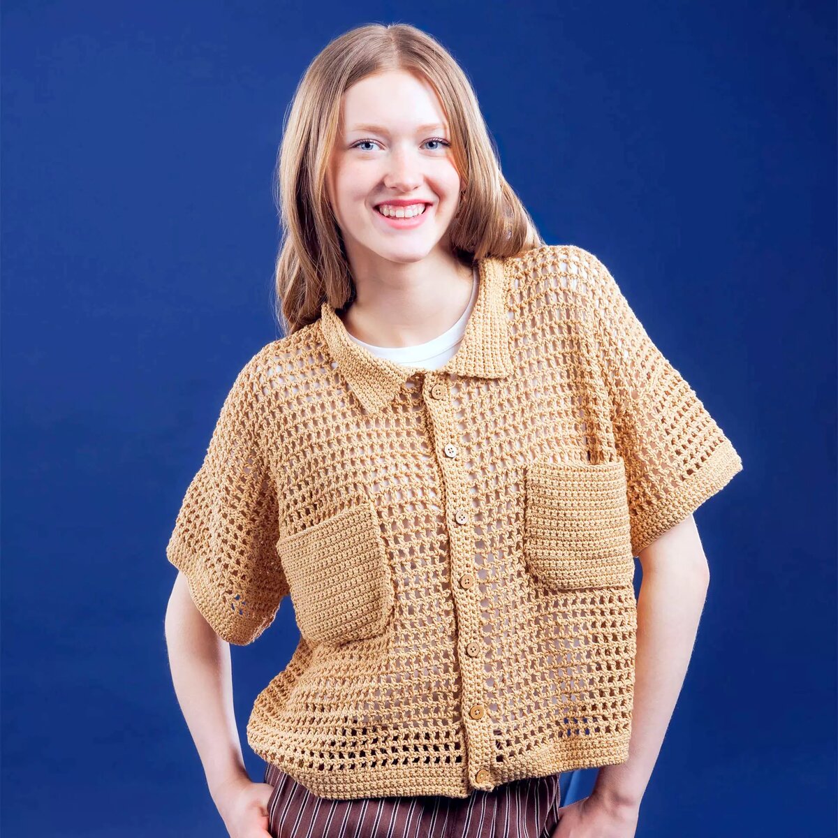 Бежевая сетчатая рубашка-поло с коротким рукавом и накладными карманами ♥