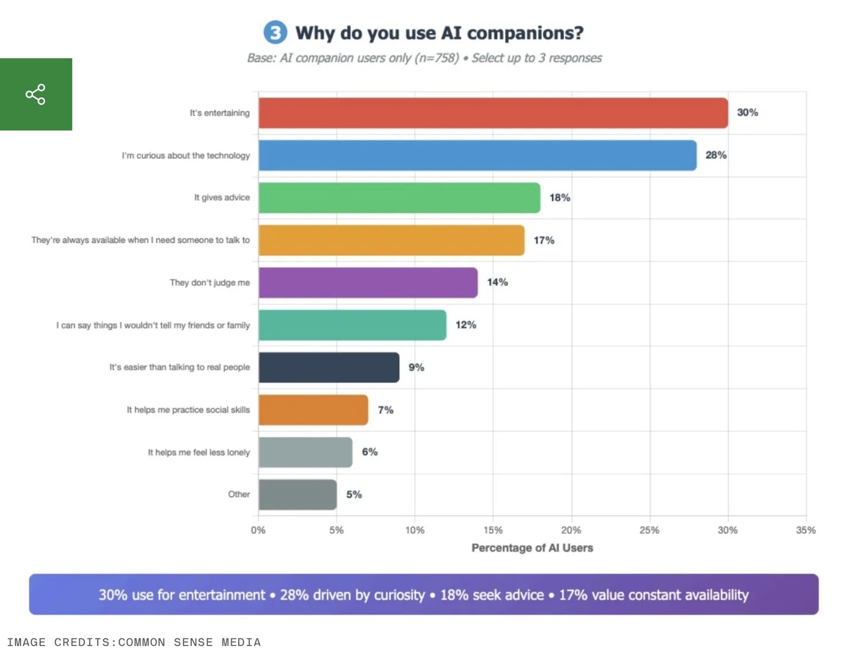 К такому выводу пришли исследователи из Common Sense Media, американской некоммерческой организации, занимающейся изучением жизни детей и семей. Под ИИ-компаньонами подразумеваются чат-боты, предназначенные для личного общения, а не только для поиска информации. К таким сервисам относятся, например, Character.AI или Replika, также в исследовании учитывались варианты, когда для личного общения используются более многофункциональные сервисы вроде ChatGPT или Claude. Исследование показало, что общение с ИИ кажется привлекательным для американских подростков (в возрасте от 13 до 17 лет), так как не только почти три четверти пробовали ИИ-компаньона, но и 52% отметили, что взаимодействуют с ним регулярно. Среди них 13% общаются с ИИ ежедневно, а 21% — несколько раз в неделю. Результаты подкреплены исследованием учёных Чикагского университета, проведённого в апреле и мае 2025 года. Выборка состояла из 1060 респондентов-подростков. Причиной интереса к ИИ-компаньонам является их постепенное рас