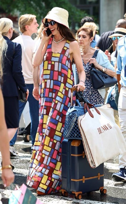 Первый трейлер сиквела "Дьявол носит Prada" появится только в мае 2026 года, но, похоже, наблюдать за развитием сюжета мы будем по ходу съемок и гадать, что же там происходит. Первые луки Энн Хэтэуэй дают намек, что она, возможно, от "серьезной журналистки" вернулась к работе в журнале "Подиум"(видите это кофр?). Особо внимательные отметили, что она не замужем (нет кольца, ахахаха). Я же отмечу прелестную сумочку-корзинку Fendi Basket Forty8 — по-настоящему удачная и запоминающаяся сумка из коллекций Кима Джонса для бренда.