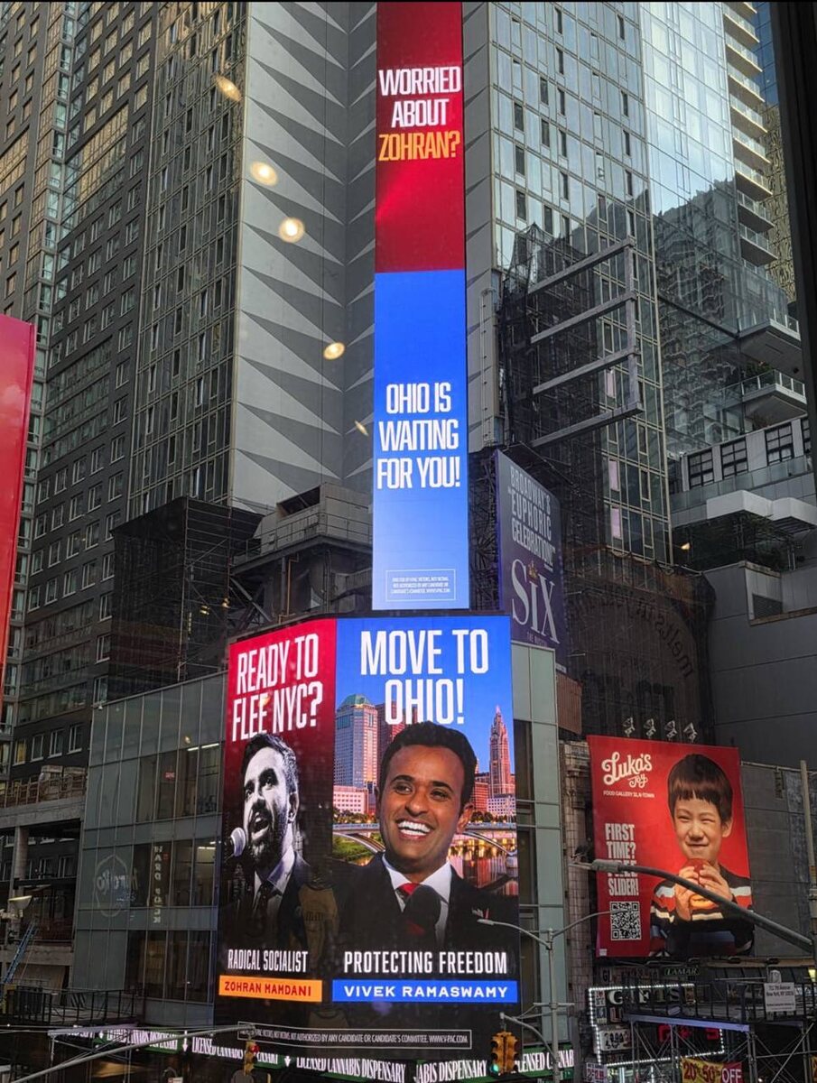На Таймс-Сквер в Нью-Йорке висит необычная реклама штата Огайо: «Переживаете на счёт Зохрана Мамдани? Огайо ждёт вас!»