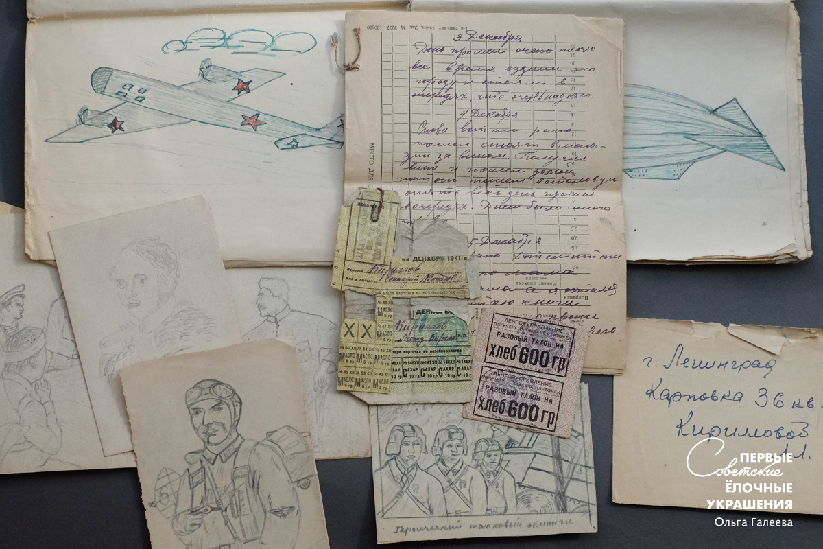 Среди семейного архива была отдельная папка, с аккуратно сложенными бумагами. Не толстая. Большей частью она состояла из рисунков: танки, самолеты, портрет М.Ю. Лермонтова. На одном из неоконченных рисунков был портрет Сталина. Принадлежали эти рисунки Гене Кириллову, 15 летнему мальчику, не пережившему Блокаду Ленинграда.