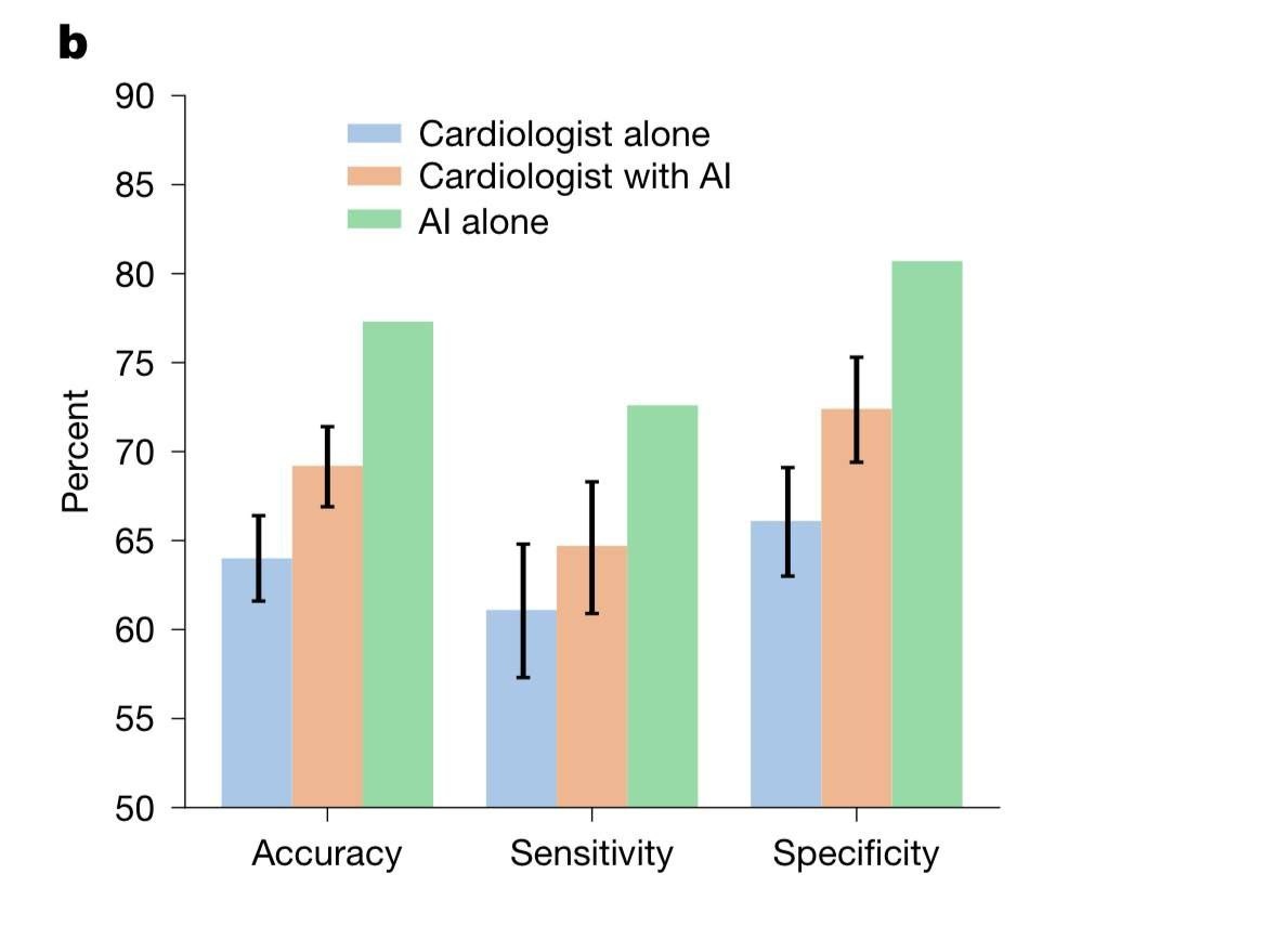 ИИ диагностирует болезни сердца точнее врачей Ученые провели эксперимент: 🔜кардиологи и ИИ-модель EchoNext анализировали одни и те же ЭКГ на признаки структурных заболеваний сердца (порок, недостаточность, ишемия). Результат впечатляет: 🔜 точность ИИ составила 77%, тогда как врачи справились на 64%. Любопытно, что даже совместная работа врача и ИИ оказалась менее точной, чем прогноз нейросети в одиночку. 🫢 🤖 Ботоферма в деле!