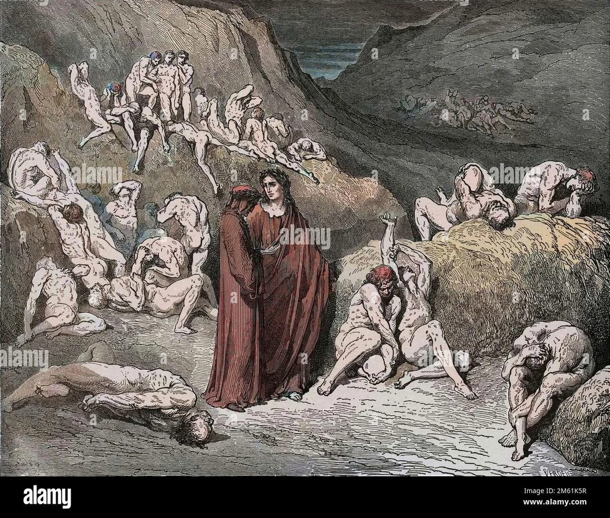 - Именно на самом дне Ада Вергилий открывает герою дверь, которая приводит их в Чистилище. Сначала герои сталкиваются с душами раскаявшихся в смертный час, а также королями и императорами, одержимыми мирскими делами. Перед подъёмом ангел наносит герою на лоб семь символов, соответствующих семи смертным грехам. После преодоления каждого круга ангелы стирают по одному символу.