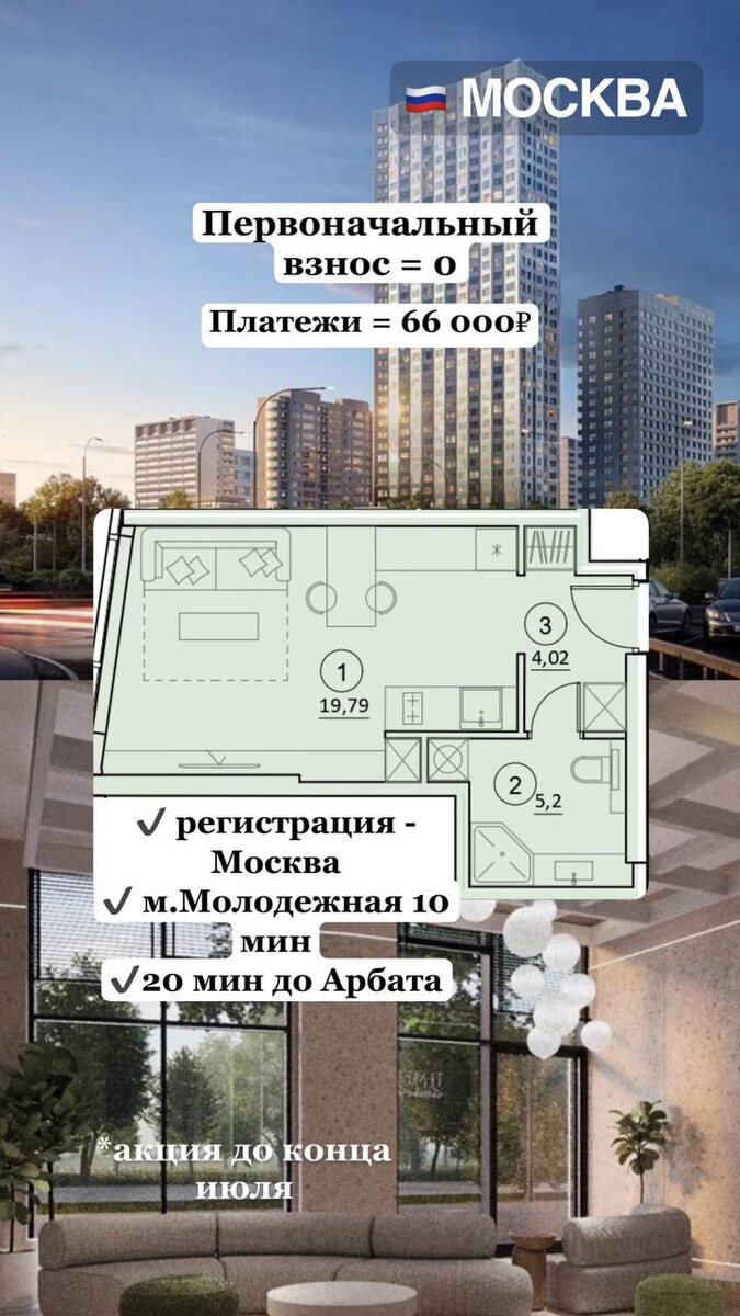 Москва. Без первоначального взноса. Учитывая повышенный интерес к программе покупки недвижимости без первоначального взноса, который мы наблюдали после публикации о Самаре, мы рады сообщить об аналогичной акции в Москве! Локация: • Г. Москва • Можайский район • 10 минут на автомобиле до м. Молодежная • 20 минут до Арбата, 30 минут до центра столицы • В непосредственной близости расположены парки «Дубки» и природно-исторический парк «Москворецкий», обеспечивающие комфортную экологию. О жилом комплексе: • Современный кирпично-монолитный дом высотой 35 этажей. • Подземный паркинг для резидентов. • Стильная архитектура и продуманные общественные пространства. • Ресепшен с консьерж-сервисом, лобби с мягкой зоной. • Предусмотрены колясочные, гостевые санузлы и даже лапомойки. Детали предложения: • Срок сдачи: 1 квартал 2028 года. • Высота потолков в квартирах: 3 метра. • Отделка: Черновая, позволяющая реализовать индивидуальный дизайн. Пример расче