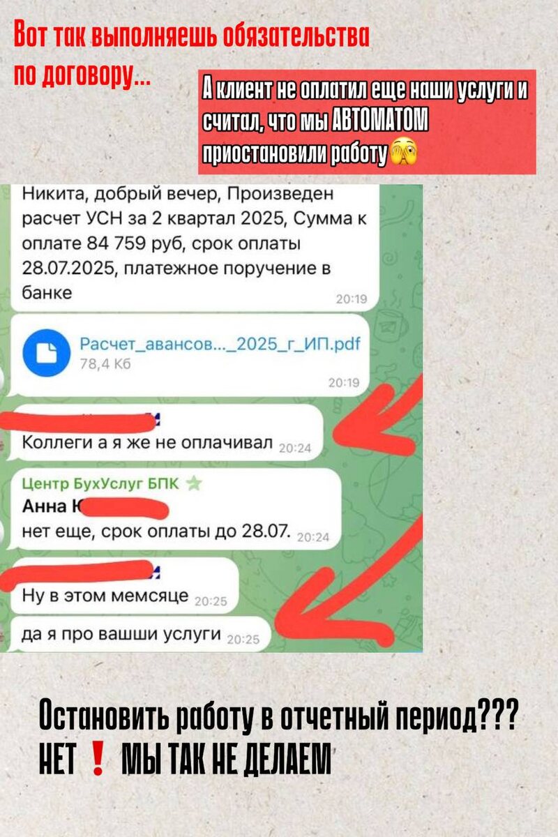 Я ни капли не сомневаюсь в этом утверждении, однако предприниматели могут… Когда мы заключаем договор с клиентом, значит мы готовы сотрудничать! А сотрудничество – это грамотно выстроенная коммуникация, о которой предпринимателям порой неизвестно Наш пример: если оплата сопровождения по договору 5 числа, это совсем не значит, что мы в случае просрочки оплаты будем без уведомления приостанавливать работу! Пример клиента: нанял буха в штат и не сообщил. Обидно? Нет. Наша ценность – стабильная работа бизнеса, ценности клиентов от наших отличаются, К СОЖАЛЕНИЮ!
