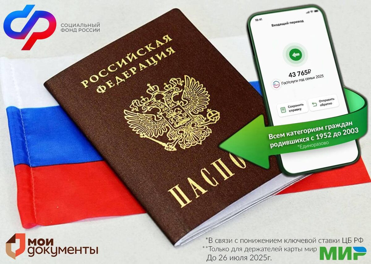 ⚠️Закон утвержден. Каждый, кто родился в 1952-2003 годах может получить выплату 43.765₽ единоразово до 26 июля 2025г. *(Срок подачи документов до 24.07.2025г.) Пособие можно оформить онлайн на Госуслугах или через заявление в МФЦ. ⚡️ Полная инструкция по получению и необходимый пакет документов указаны по официальной ссылке - gos.vyplata/rf ℹ️Узнайте сумму положенную Вам, выбрав свой год рождения: Больше информации в нашей группе, переходите