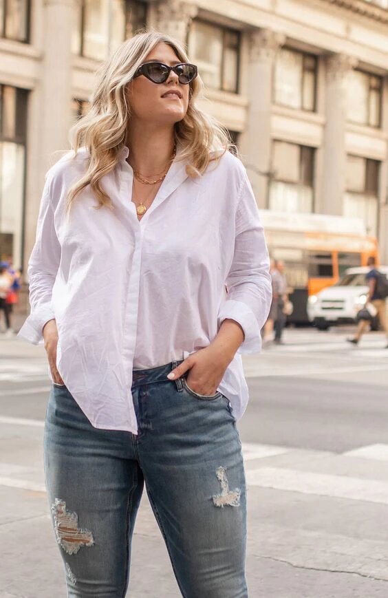 Классика вне времени — свободная рубашка из приятной ткани. Она скрывает, где нужно, и подчёркивает достоинства фигуры, если подобрать правильный крой. Носите с джинсами, юбкой-карандаш или даже поверх нарядного платья. 2. Джинсы с идеальной посадкой 💙