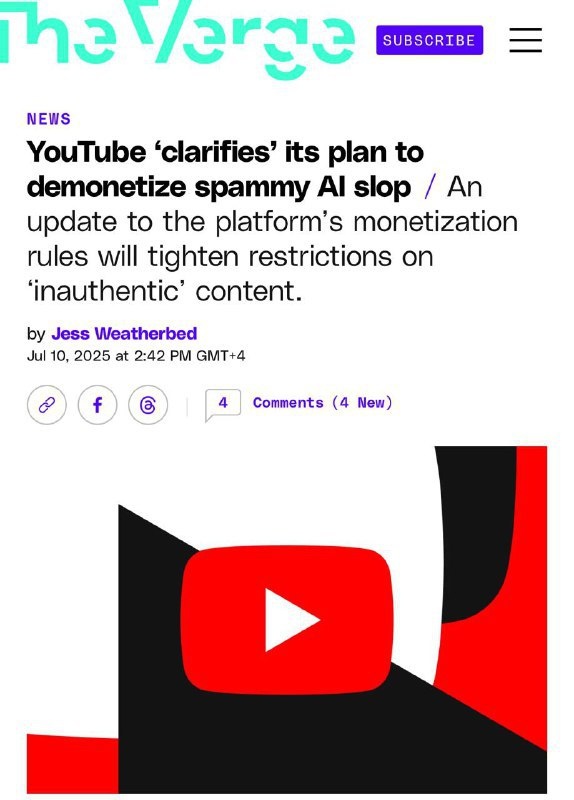 Google устроил чистку — теперь Ютуб больше не будет платить за трэш-контент, полностью слепленный нейронками. По свежим правилам монету отрежут у следующих роликов: — Перелопаченные или перезалитые видосы под видом новых; — Копипаст или сборка из чужих материалов; — Всякая халтура типа «один дубль» или видосы, где просто снимают рабочий стол; — Всё, что связано с нюдесами или темами 18+; — Видео, полностью собранные ИИ; — Клипчики, где звучит только синтезированный голос, без участия живых людей. AI slop официально объявили вне закона. Мусорные видосы — в топку. Подробнее: https://hard-tm.su/threads/100917/ 🕹HARD-TM — Подписаться