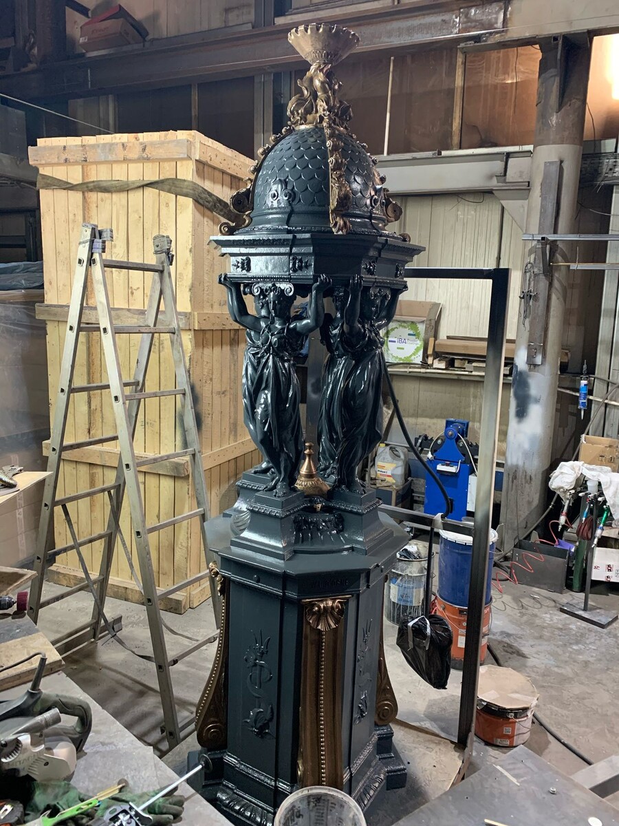 Вот мы и добрались до самой интересной части рассказа — что же у нас получилось? В таком виде отреставрированные элементы фонтана Уоллеса: кариатиды и чаша покинули цех MAFSTORE: Если вернуться назад и посмотреть на исходное состояние, то можно увидеть, что все имеющиеся дефекты были устранены в рекордно короткие сроки. При этом реставрация проводилась по всем правилам с соблюдением полной технологии. Именно такой подход позволяет обеспечить качественный и долговечный результат. Здесь фонтан уже на своем законном месте — центральная аллея названного в честь него жилого квартала «Серебряный фонтан»: Наши специалисты не только отреставрировали объект культурного наследия, но и транспортировали его безопасным способом, смонтировали и проверили работоспособность. Как и писали в прошлой части, было это 19 апреля 2025 года. С приходом тепла фонтан начал полную сезонную работу и теперь радует жителей района красивыми переливами струй воды. Увидеть единственный в России фонтан Уоллеса могут в