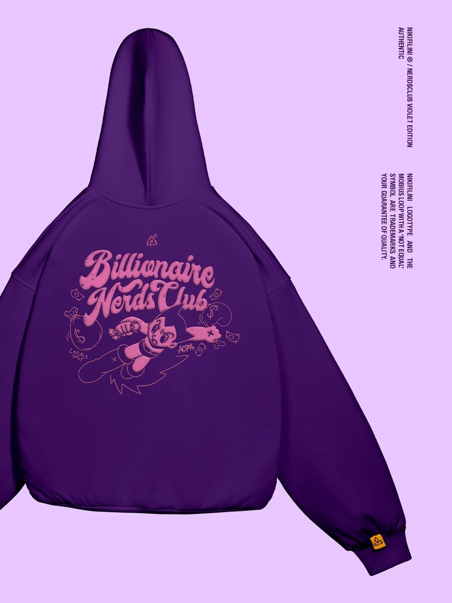 NERD$CLUB VIOLET EDITION Надпись «Billionaire Nerds Club» — оммаж на «Billionaire Boys Club», только с перекрутом. Вместо гламура — клуб нердов. Не про понты, а про тех, кто в теме. Персонаж — переосмысленный Астробой (Astro Boy). Классический японский герой 60-х, символ техно-наивности. Но здесь он: – в классическом образе, но с новой подачей – летит с деньгами вокруг – на фоне мелкие детали: «Locals only», знак авторства ACRA x NIKIFILINI Мы сделали не просто «героя из прошлого», а почти мета-комментарий: нерд, который вырос, но не забыл, откуда он.