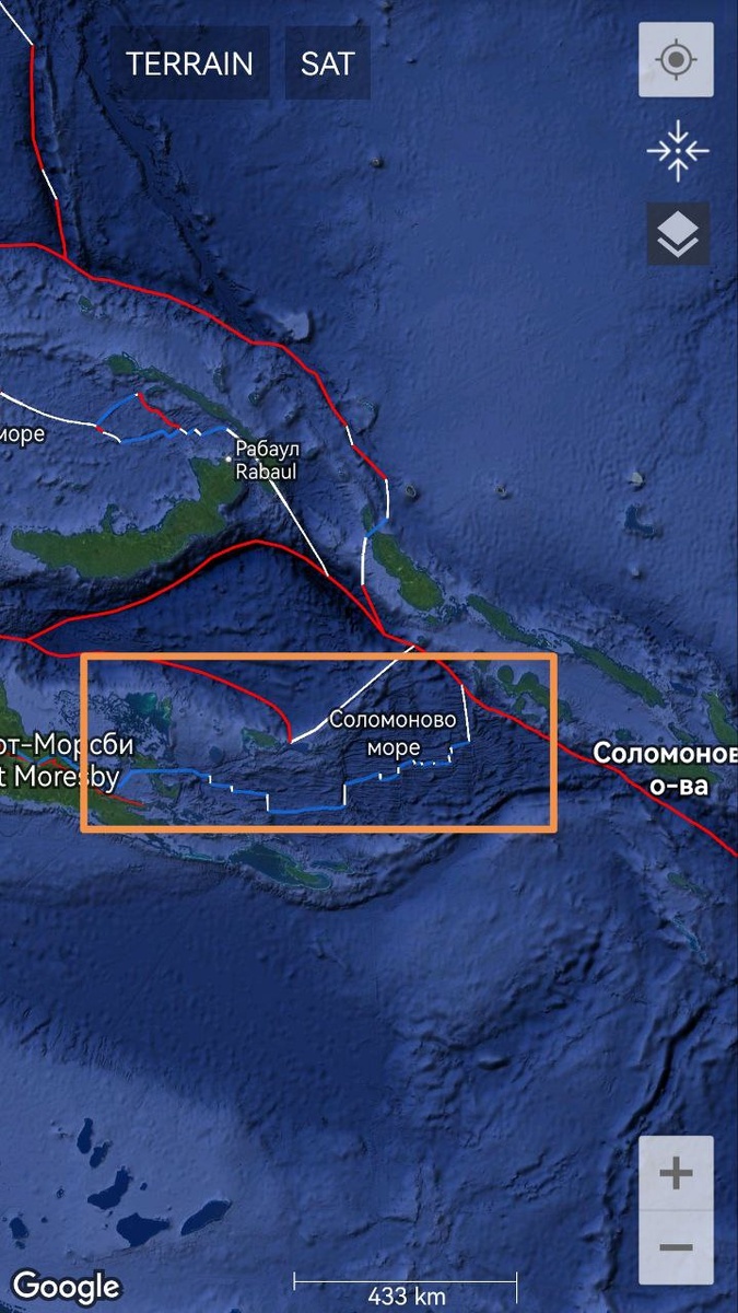 Есть вероятность землетрясения М6-7 по южной границе плиты Woodlark (Соломоново море) в течение 9 дней