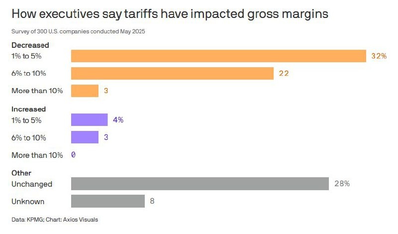 «Согласно новому опросу, тарифы Трампа уже снижают рентабельность корпораций» 77% респондентов заявили, что их компании рассматривают возможность повышения цен как минимум на 5% в течение следующих шести месяцев https://www.axios.com/2025/07/09/trump-tariffs-margins @marketheart