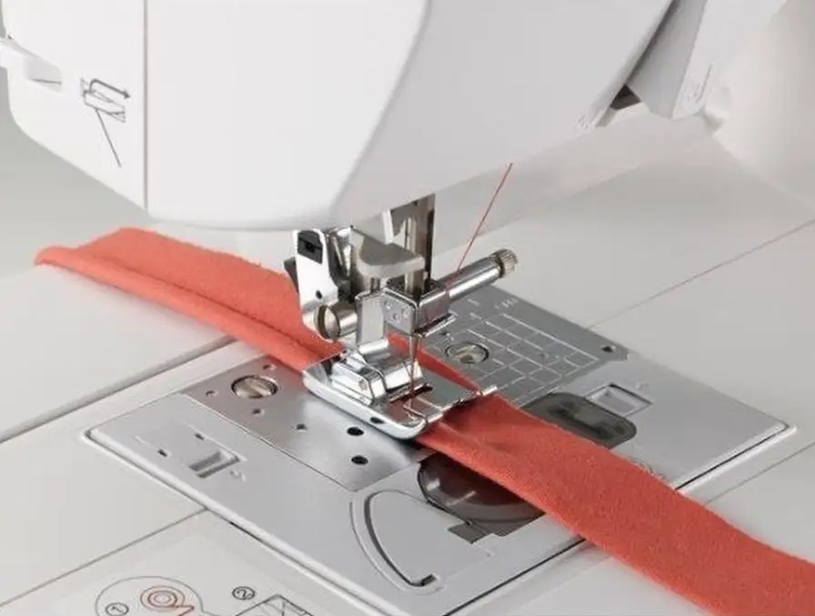 Этот шов выполняют двумя способами: с приспособлением и без. С приспособлением кант складывается пополам лицевой стороной вверх, помещается между деталями и прокладывается строчка.