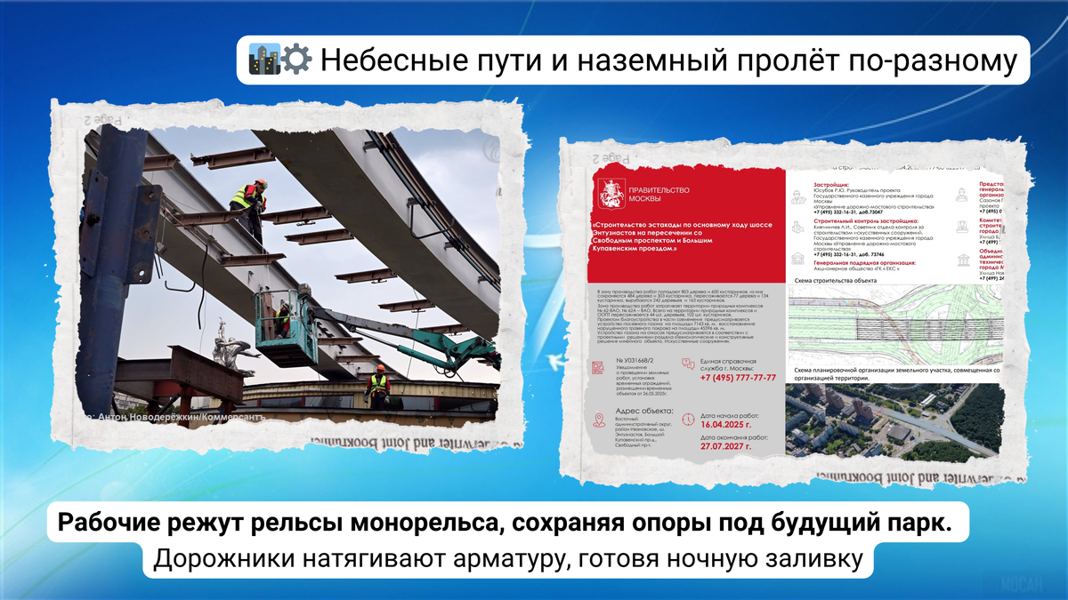 официальные отчеты. Давайте вместе разберемся, что же на самом деле происходит с нашей Москвой. Поехали? Во-первых, поглядим на работы на закрытых станциях и эстакадах 🚝 Московского монорельса. Ведётся строительство подземного пешеходного перехода, подпорных стен эстакады и устройство опор эстакады. ------------------------------------------------------------------------------------ Ну вот, друзья, мы и добрались до финала нашего обеденного мини-репортажа. Знаете, мы тут в редакции немного переживали, не утомили ли мы вас этой кучей информации.