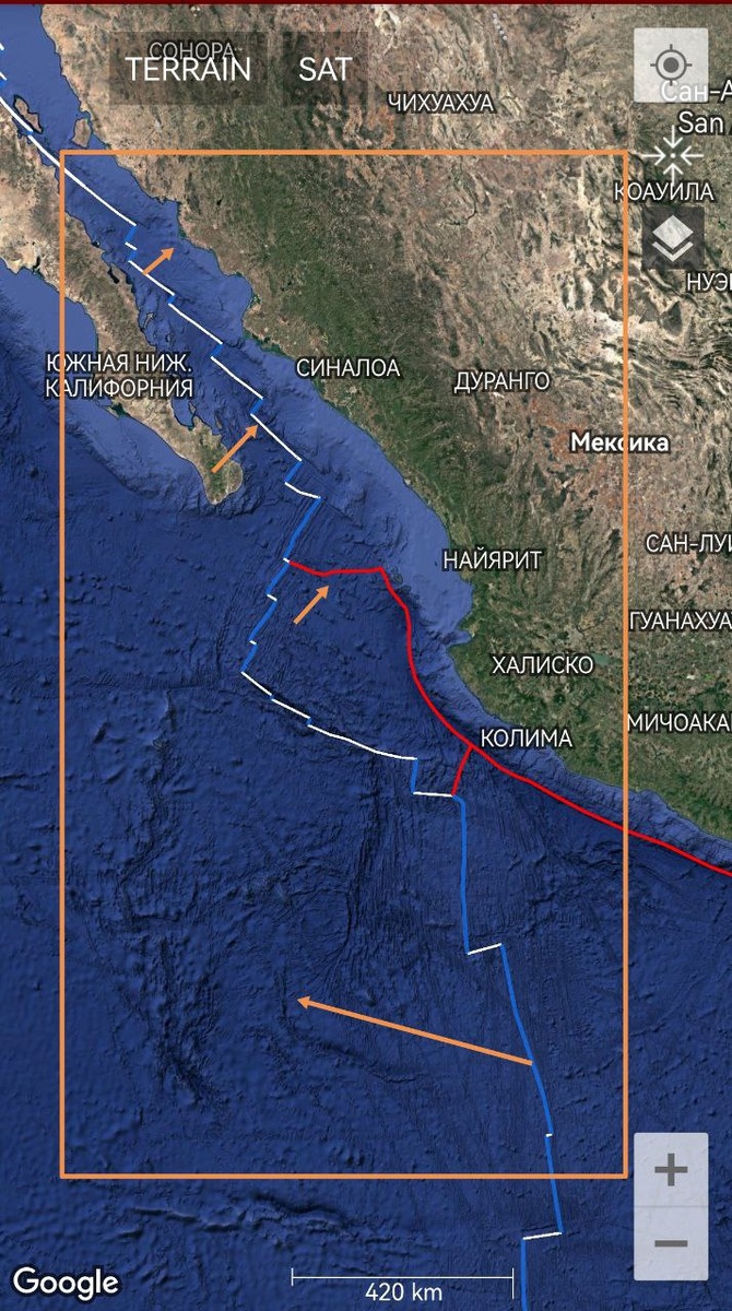 Есть вероятность землетрясения М6-7 в районе плиты Rivera и в южной части Калифорнийского залива до 19 июля ===== There is a possibility of an M6-7 earthquake in the area of the Rivera plate and in the southern part of the Gulf of California before July 19.